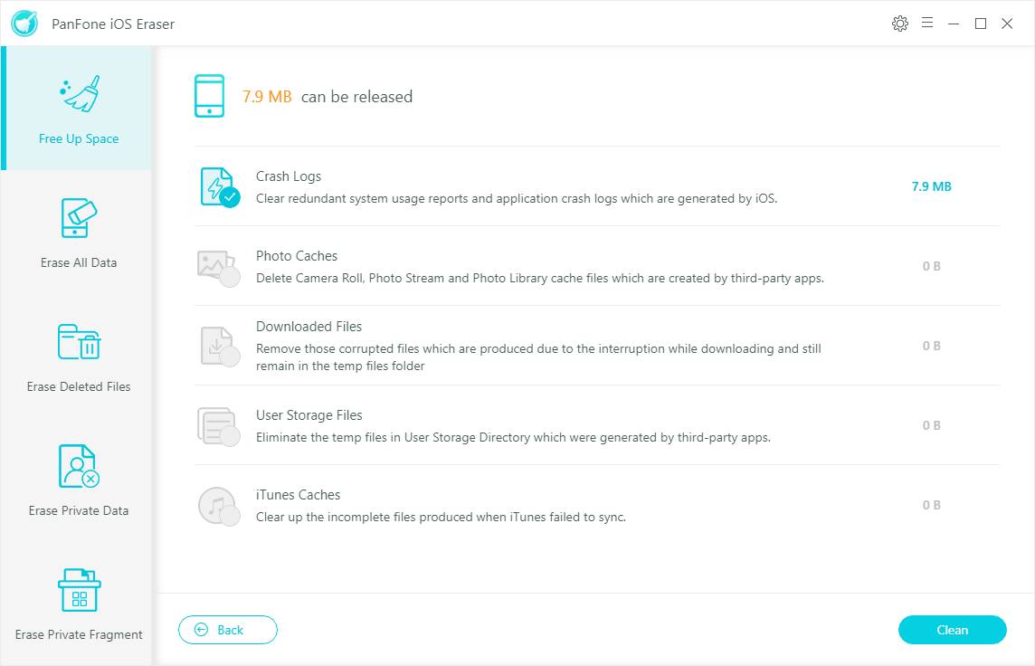PanFone iOS Eraser is a tool to instantly delete all these junk files to free up more space on your iOS device. It also supports to erase messages, contacts, call history, photos & video, browsing data and more with 0% recovery.