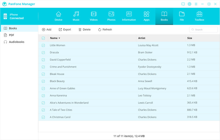 To manage Books, PDF files and Audiobooks on your iOS devices, connect your iPod touch, iPhone or iPad to your computer, then launch PanFone Mobile Manager. Go to ‘Books’ module on top manu bar and there’re 4 options: ‘Add’, ‘Export’, ‘Delete’ and ‘Refresh’.